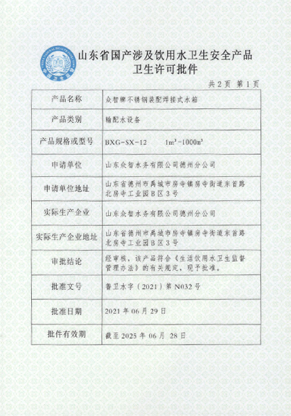 涉及飲用水衛(wèi)生安全產(chǎn)品衛(wèi)生許可批件-水箱