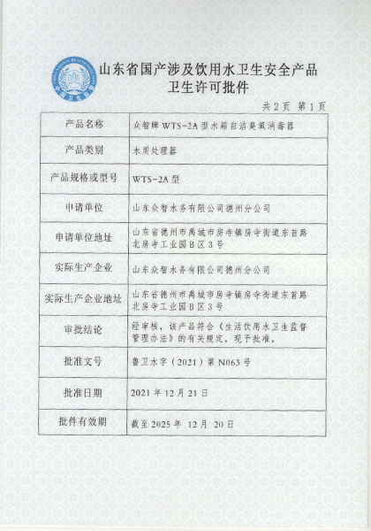 涉及飲用水衛(wèi)生安全產(chǎn)品衛(wèi)生許可批件-水箱自潔消毒器