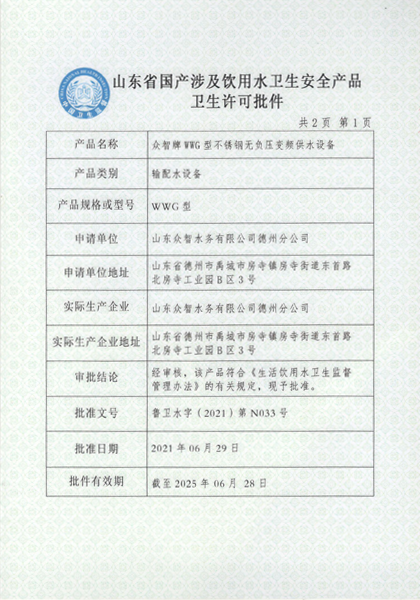 涉及飲用水衛(wèi)生安全產(chǎn)品衛(wèi)生許可批件-供水設(shè)備